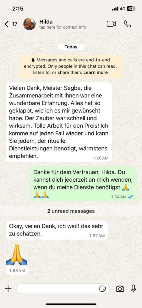 Ich bin König Marabu, ein erfahrener Spezialist für traditionelle Voodoo-Rituale mit nachweislichem Erfolg. Egal, welches Problem dich plagt, ich kann dir mit der kraftvollen Magie des Voodoo helfen. Leidest du unter Liebeskummer oder hast Schwierigkeiten in deiner Beziehung? Möchtest du, dass dein Ex-Partner wieder Interesse an dir zeigt oder zu dir zurückkehrt? Ich führe authentische und mächtige Rituale durch und sende dir als Beweis für ihre erfolgreiche Durchführung originale Bilder und Videos. Meine Liebesrituale sind darauf ausgelegt, deinen Partner zurückzubringen und deinen Wunschpartner dazu zu bringen, dich innerhalb weniger Tage zu heiraten und zum Altar zu begleiten. Sollte dein Partner in Sachen Treue nicht ganz zuverlässig sein, biete ich auch Treuemagie an. Falls dein Partner bereits in einer anderen Beziehung ist, kann ich mit einem Trennungszauber eingreifen, um den Rivalen aus dem Weg zu räumen. Hast du das Gefühl, von einem Fluch belastet zu sein? Bist du arbeitslos oder hast ständig Pech? Ich führe spezielle Rituale durch, um Flüche zu lösen und dich von negativen Energien zu befreien. Auch die Heilung von Krankheiten mit Pflanzen und Voodoo-Ritualen ist sehr gefragt. Hast du einen Kinderwunsch? Auch hierbei kann ich dir mit meiner schwarzen Magie helfen. Kontaktiere mich noch heute über WhatsApp, und ich mache dir ein unverbindliches Angebot.